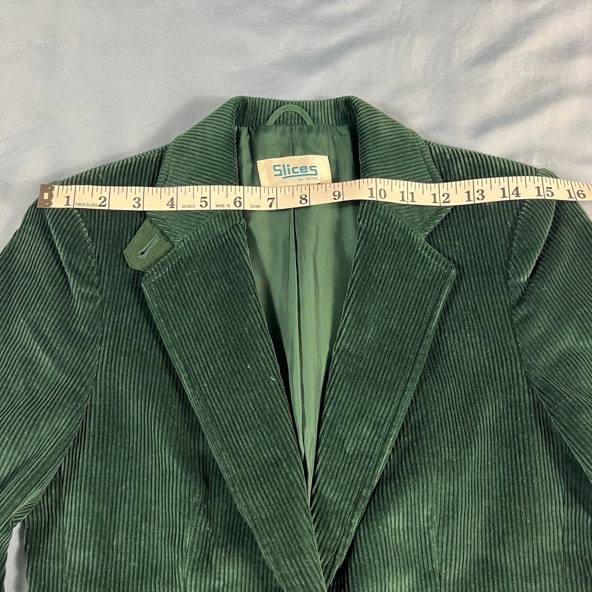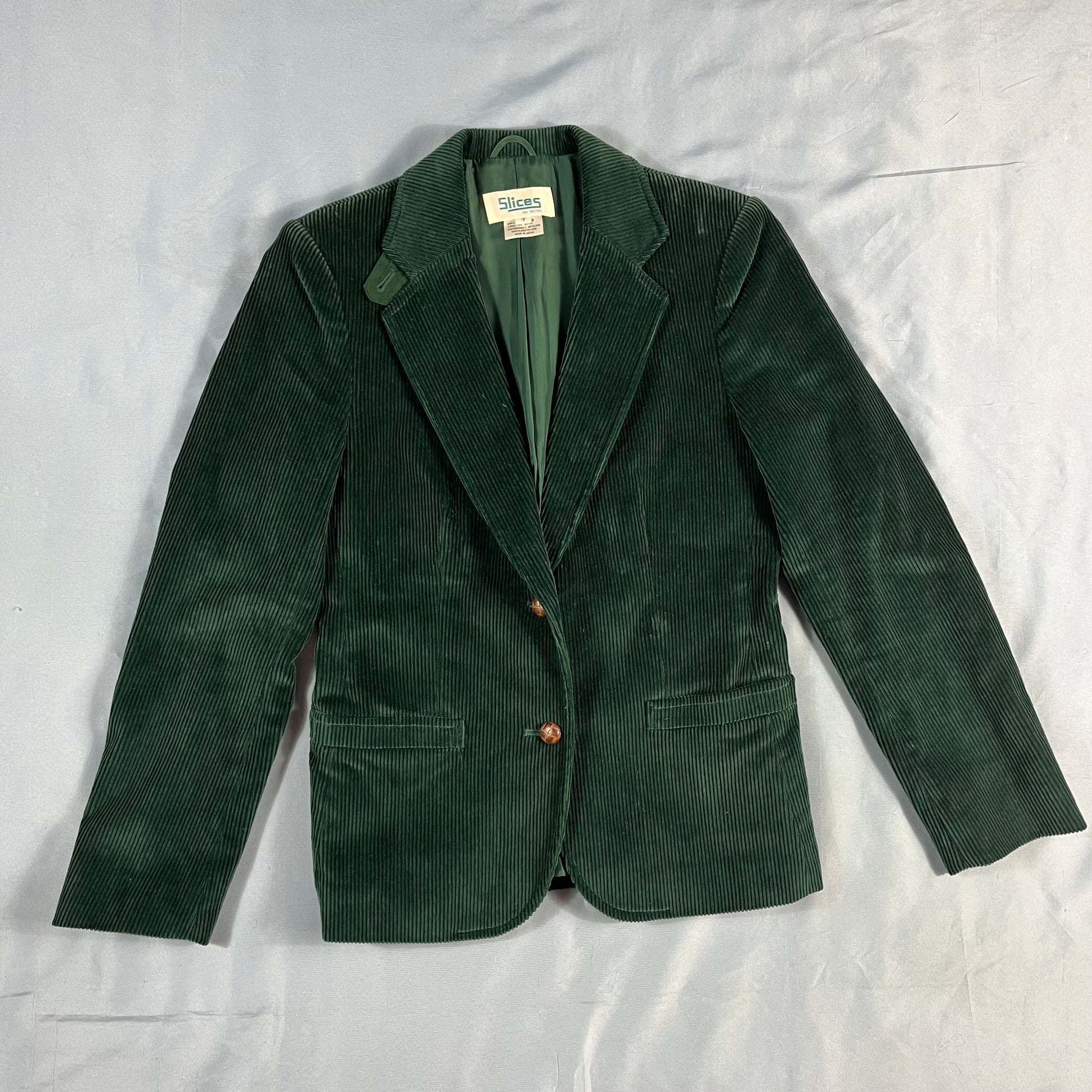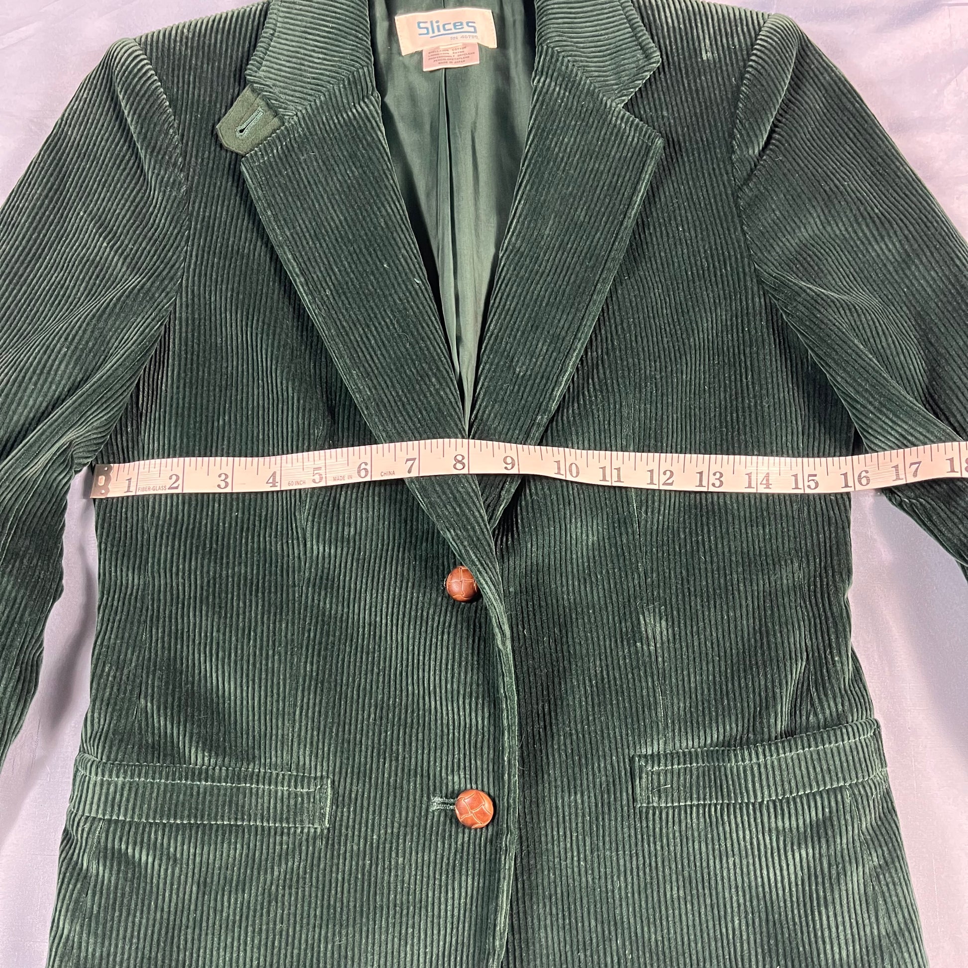 1990s vintage Slices tailored blazer. a stylish petite jacket featuring green corduroy, elbow patches, and a classic two-button front.