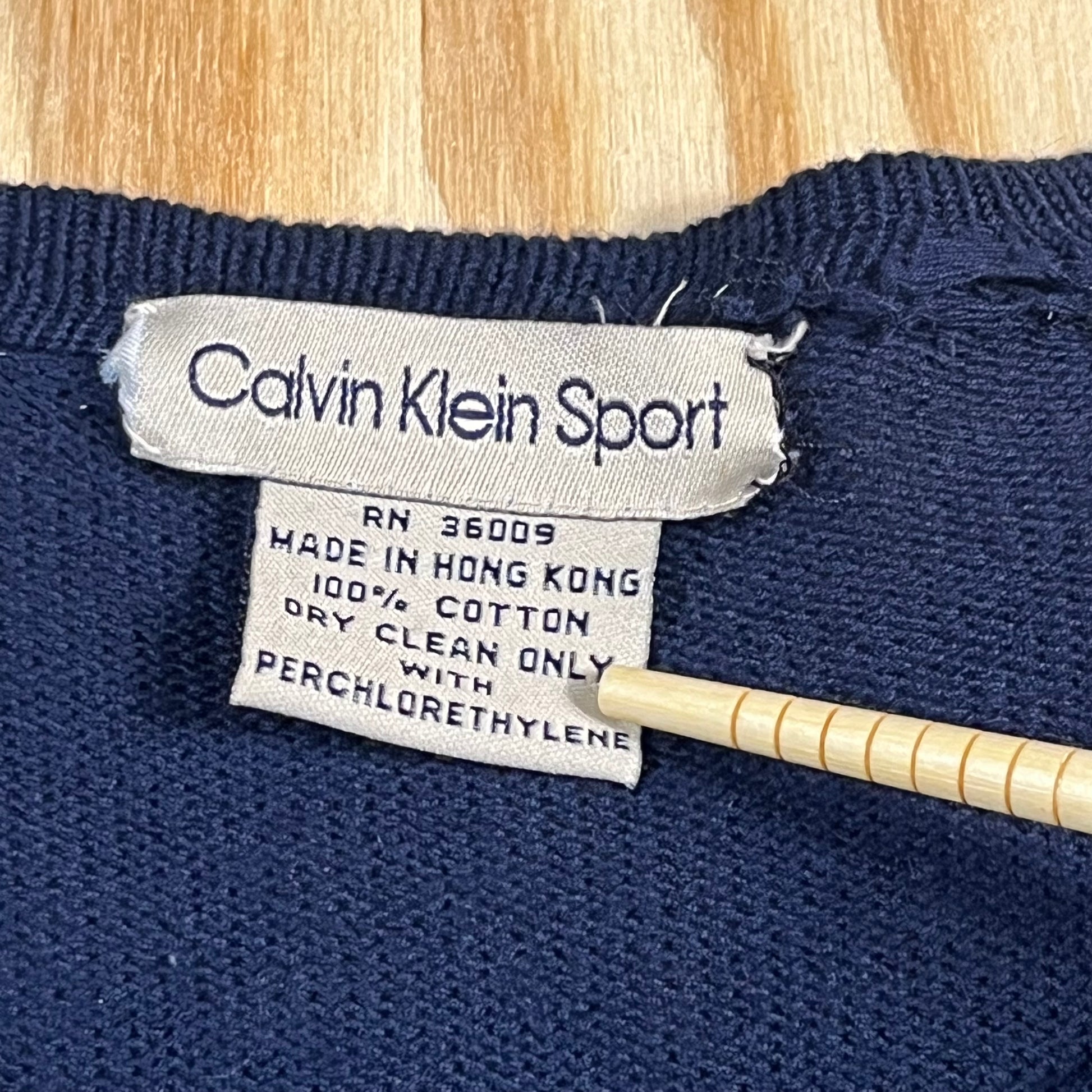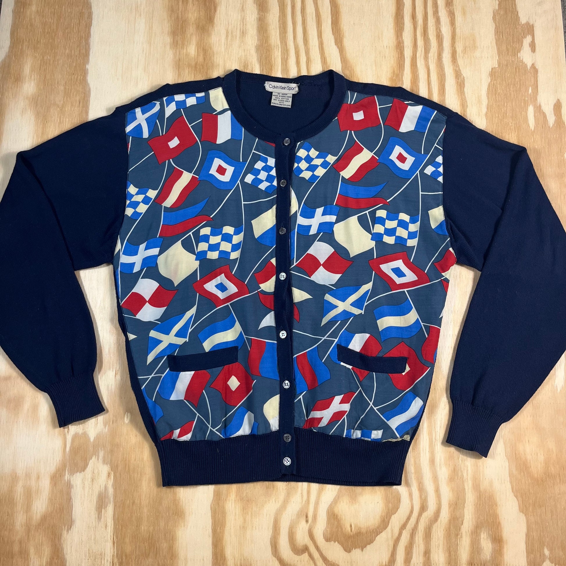 details: Calvin Klein Sport, made in Hong Kong, flag appliqué, two front pockets, full button closure, americana, designer knitwear, 90s vintage