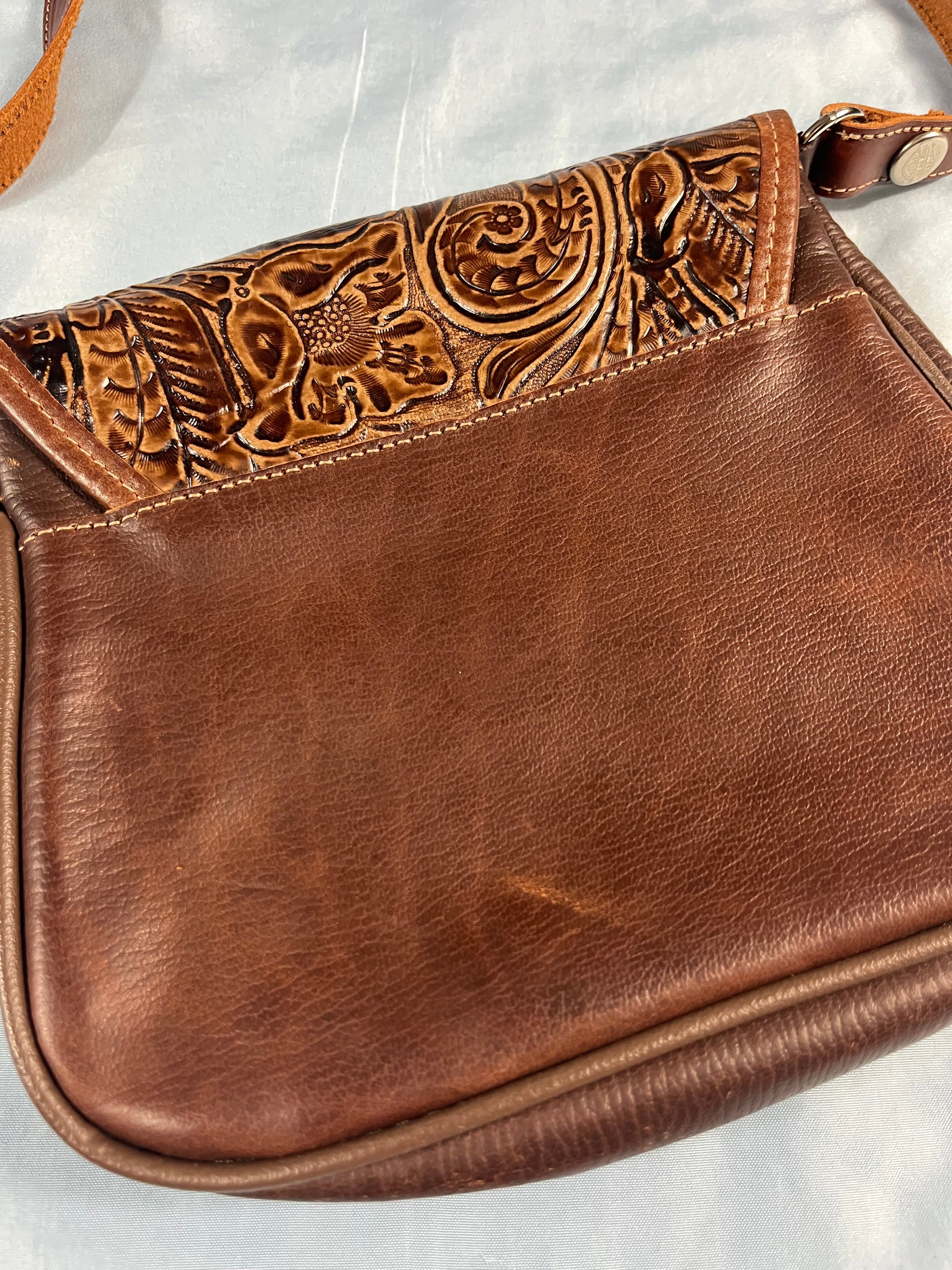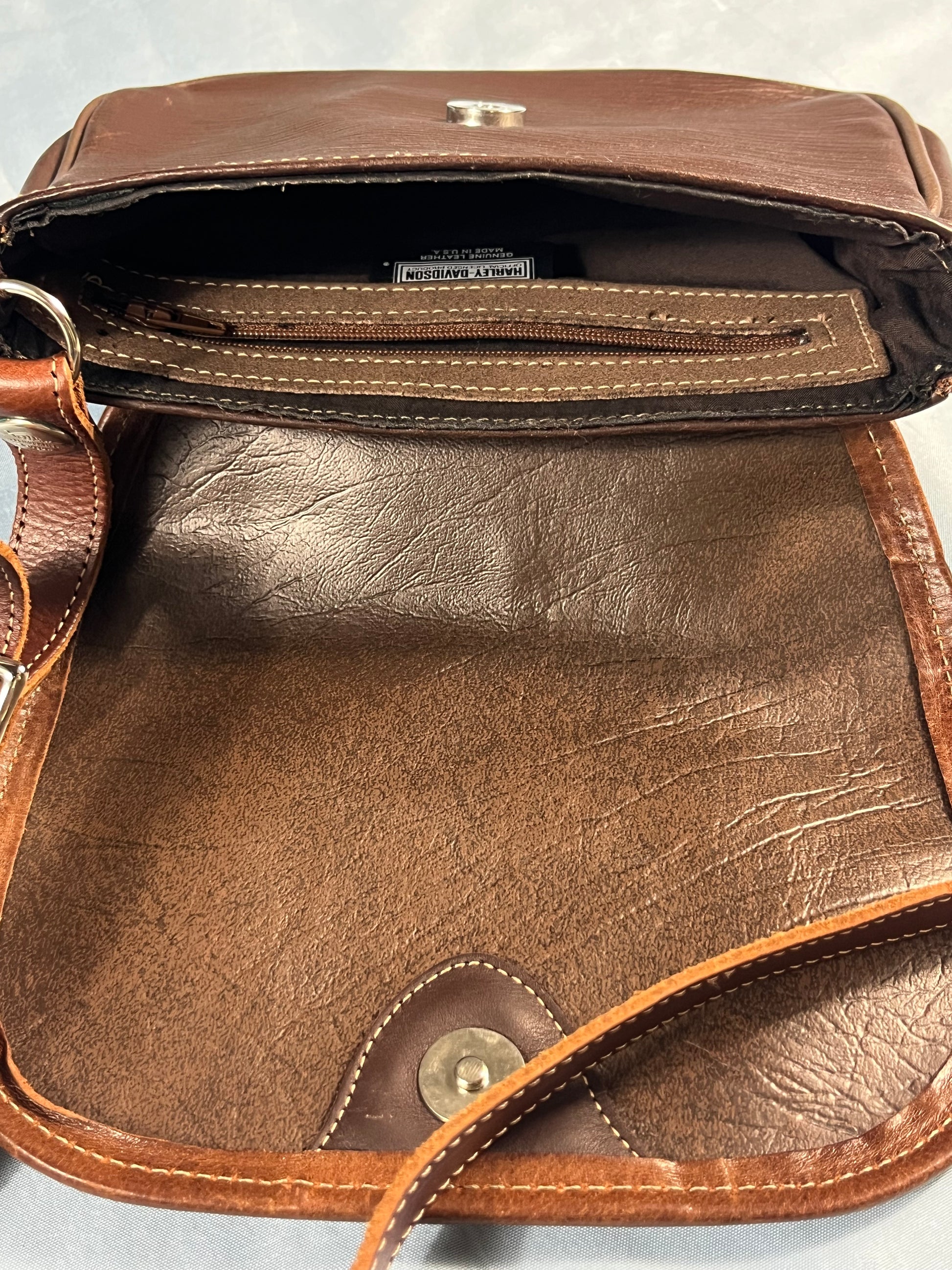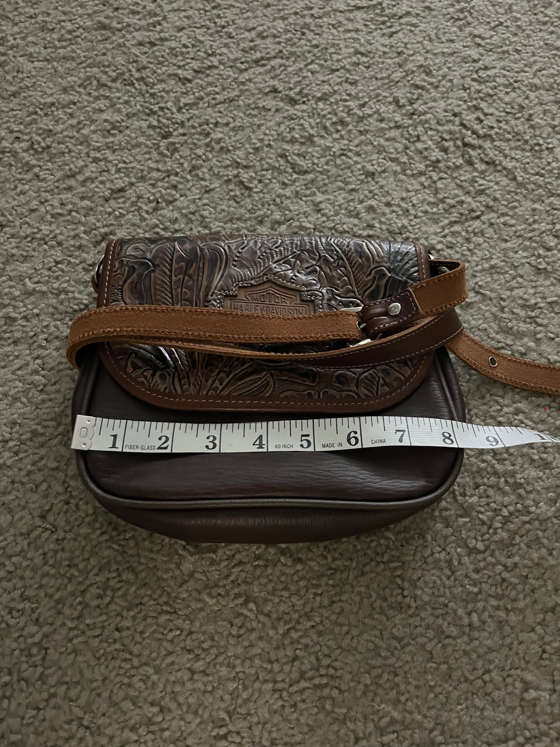 The Harley Davidson Floral Leather Crossbody Purse is a stylish and compact handbag designed specifically for crossbody wear. Made from high-quality leather with a vintage floral pattern, this brown purse features a zip, magnetic, and snap closure, along with silver hardware accents. The adjustable crossbody strap adds versatility to the design, making it suitable for various occasions. This small bag exudes a motorcycle theme, perfect for Harley-Davidson enthusiasts who appreciate a blend of detail and style in their accessories. Made in the United States, this purse combines practicality with a touch of biker chic.