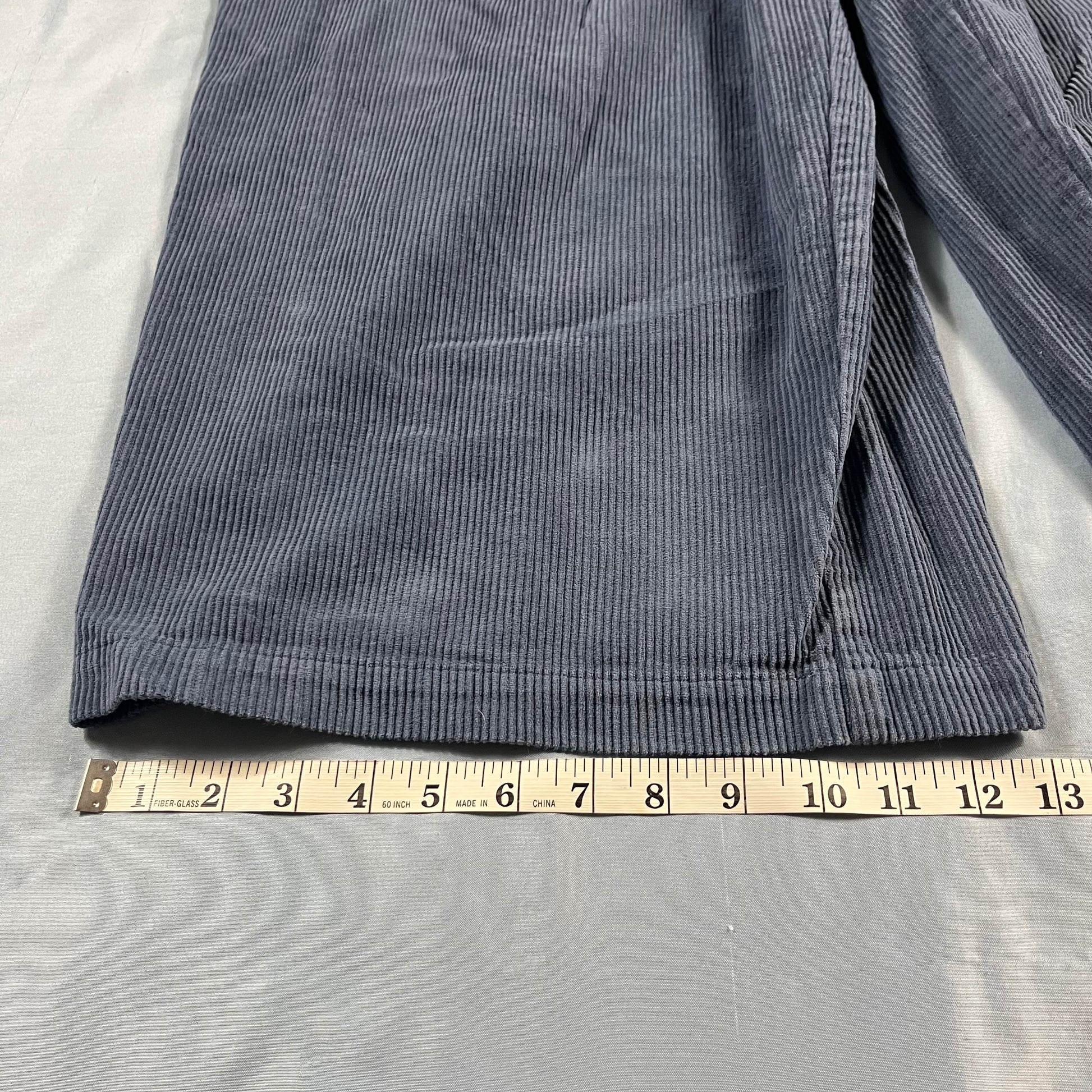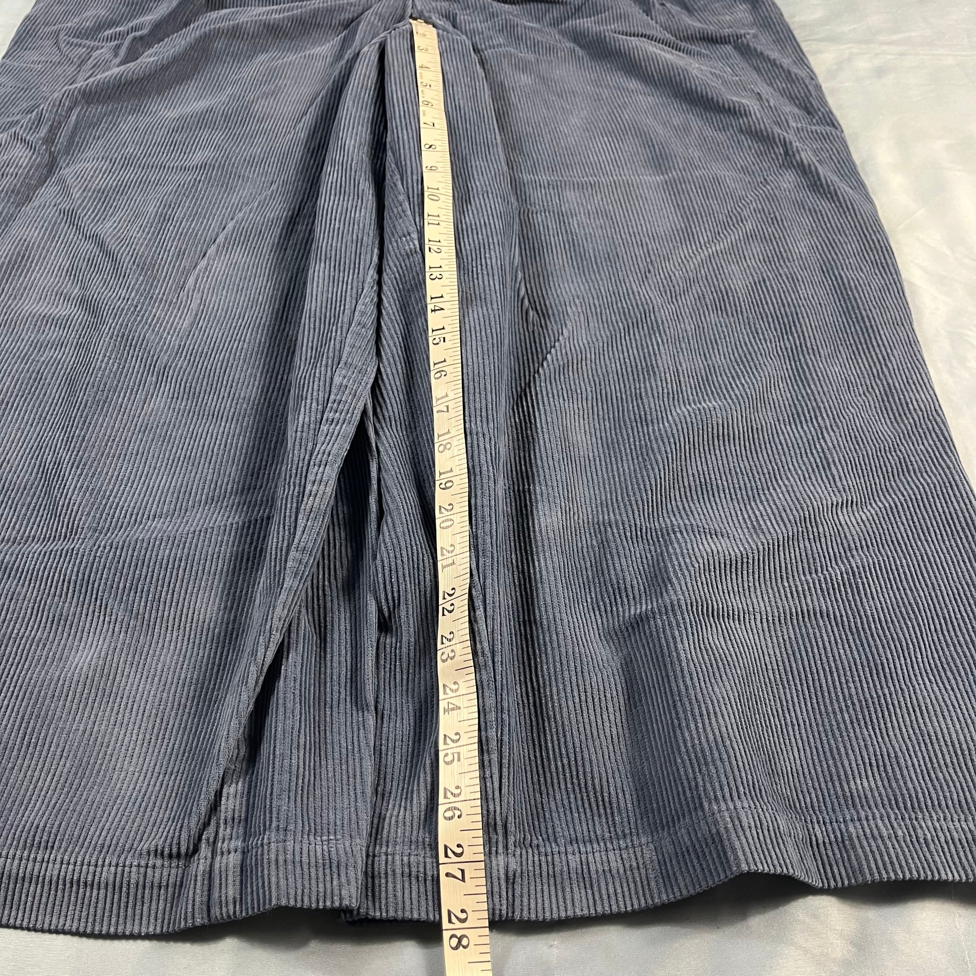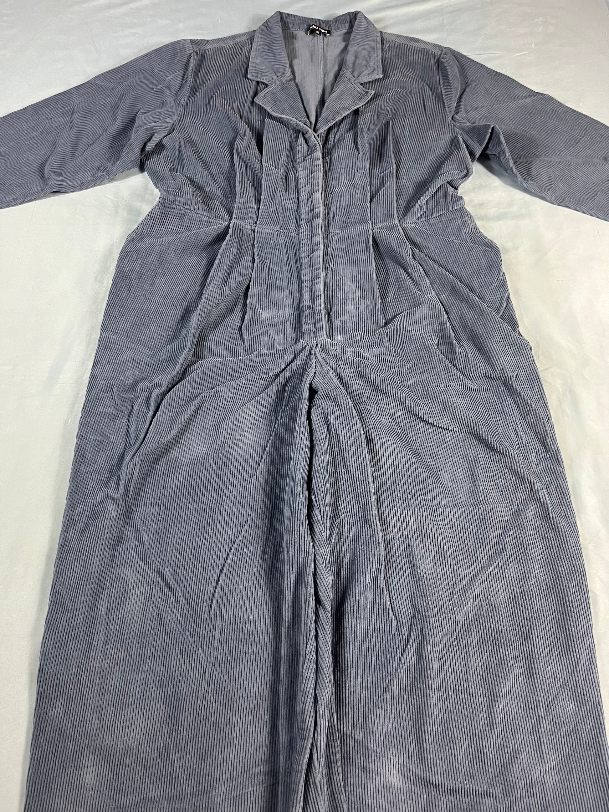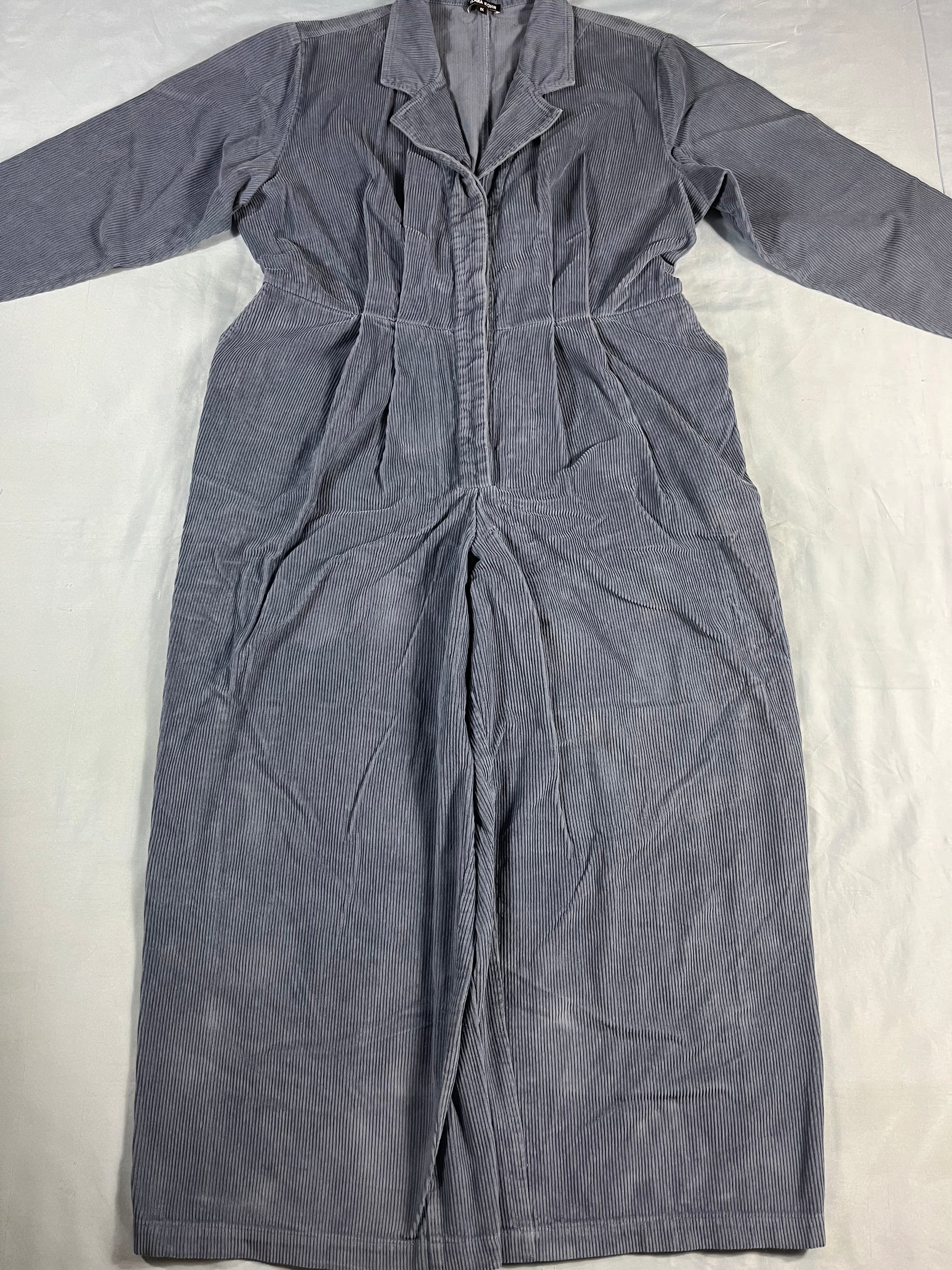 a rare, sophisticated find from Ilana Kohn. the "Lauren" jumpsuit is a masterclass in structural tailoring, featuring a double-pleated front and vertical darting that creates a cinched, almost boned appearance at the waist. this iteration is crafted from a lush, medium-weight blue corduroy, adding a rich texture to the signature wide-leg silhouette. unlike her traditional boxy coveralls, the "Lauren" offers a more defined, elegant form. a quintessential future vintage staple, proudly made in nyc.