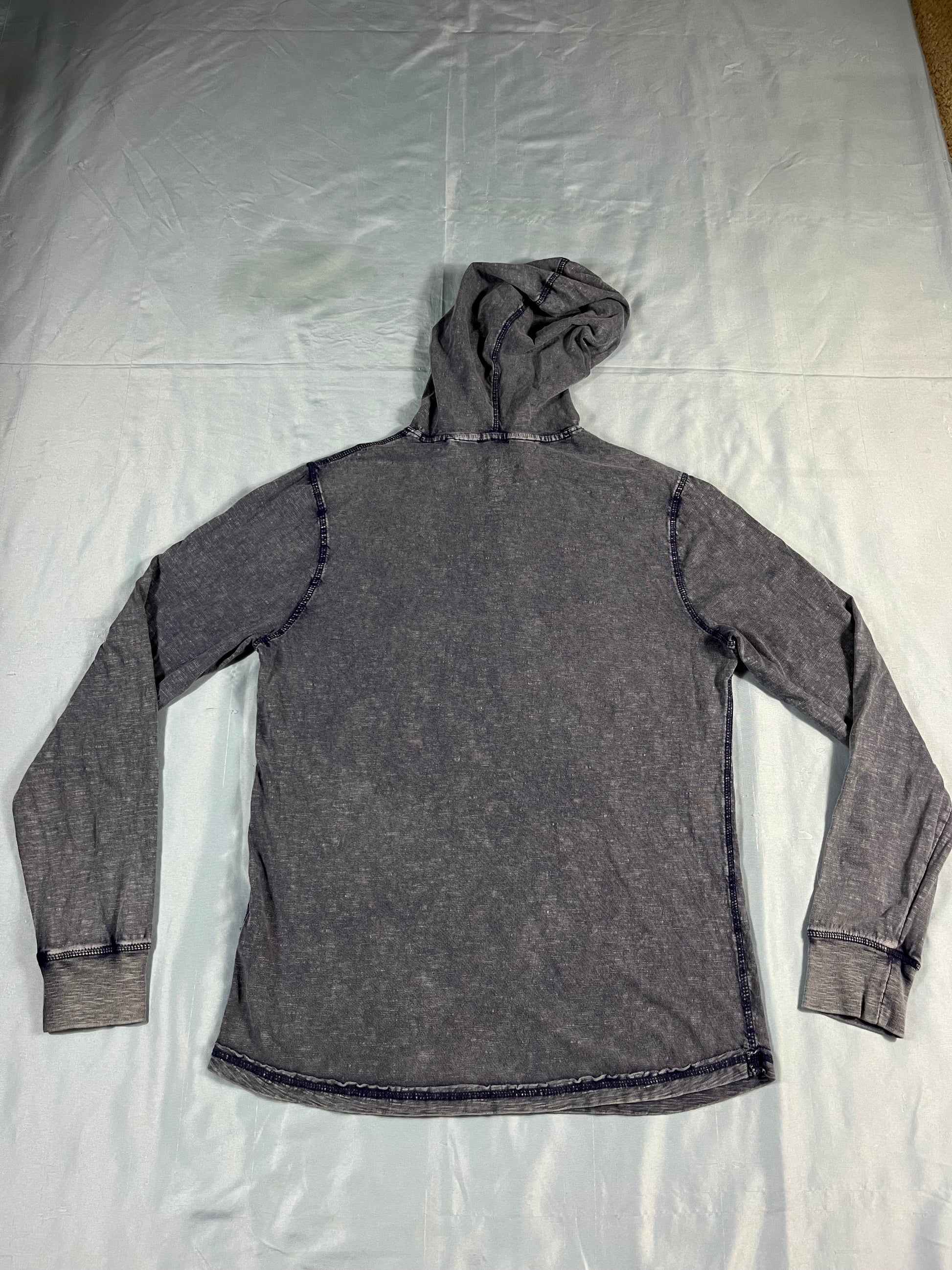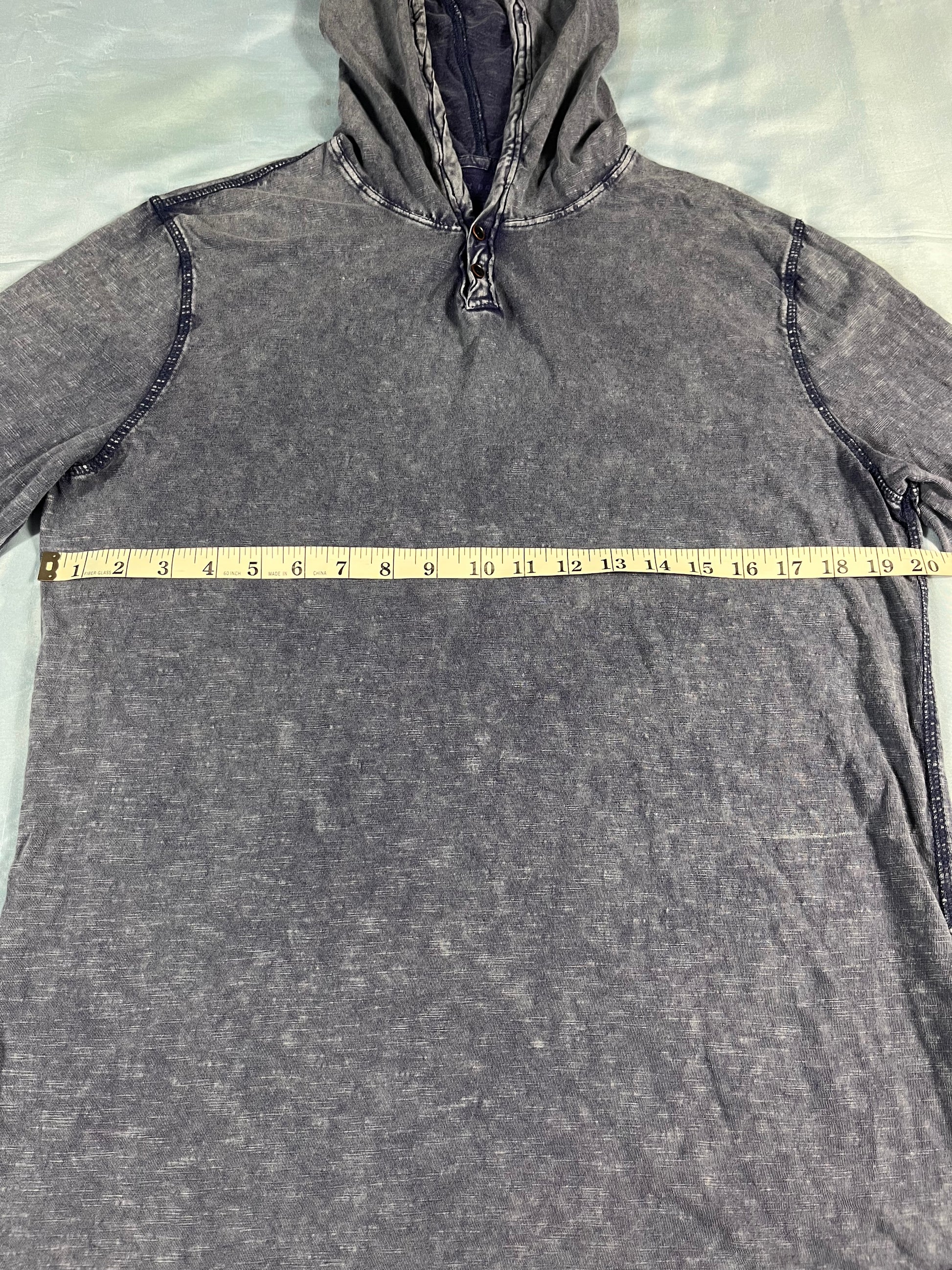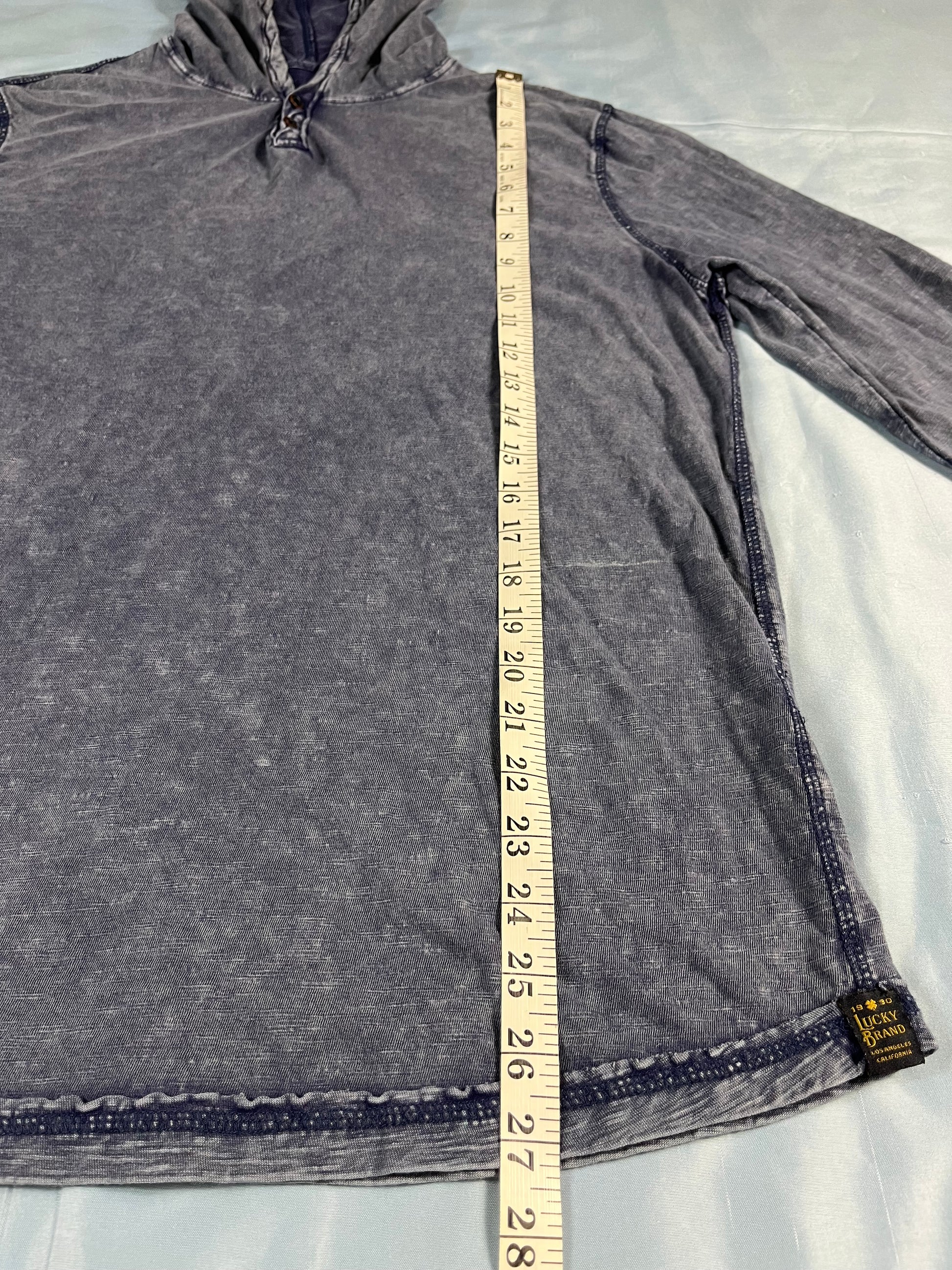 The Lucky Brand Men's Venice Burnout Hooded Pullover is a stylish and comfortable shirt in size Large, featuring a solid blue color with a Henley neckline and long sleeves. Made from a blend of polyester and cotton, this lightweight shirt is perfect for all seasons and has a regular fit. The hooded design adds a touch of grunge and class to this classic T-shirt, making it a versatile addition to any man's wardrobe. Made in Guatemala, this shirt is a great choice for those looking for a quality and trendy piece of clothing.