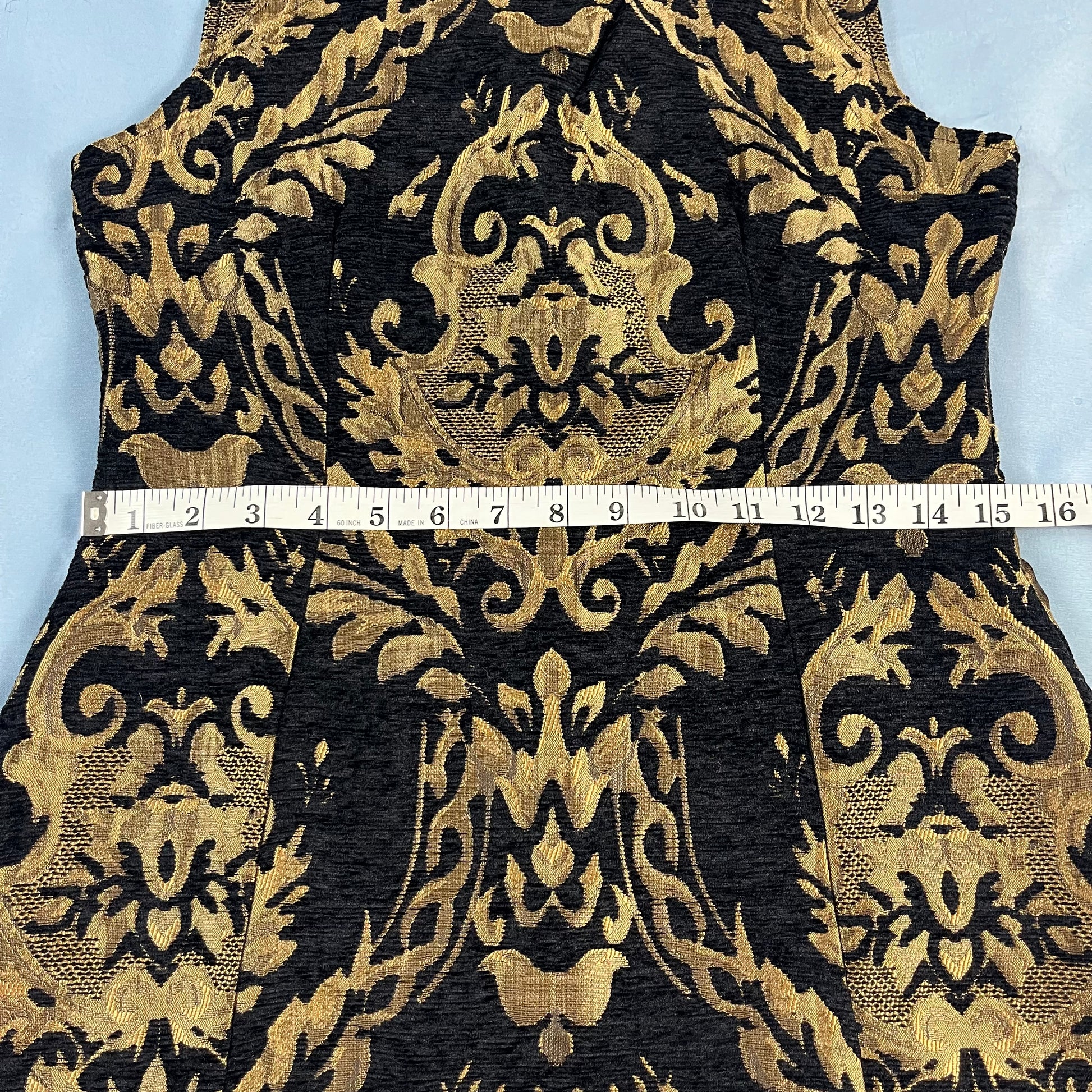 metallic, jacquard, brocade, pattern, ornate, cocktail, evening, mini dress, black, gold, holiday, whimsygoth