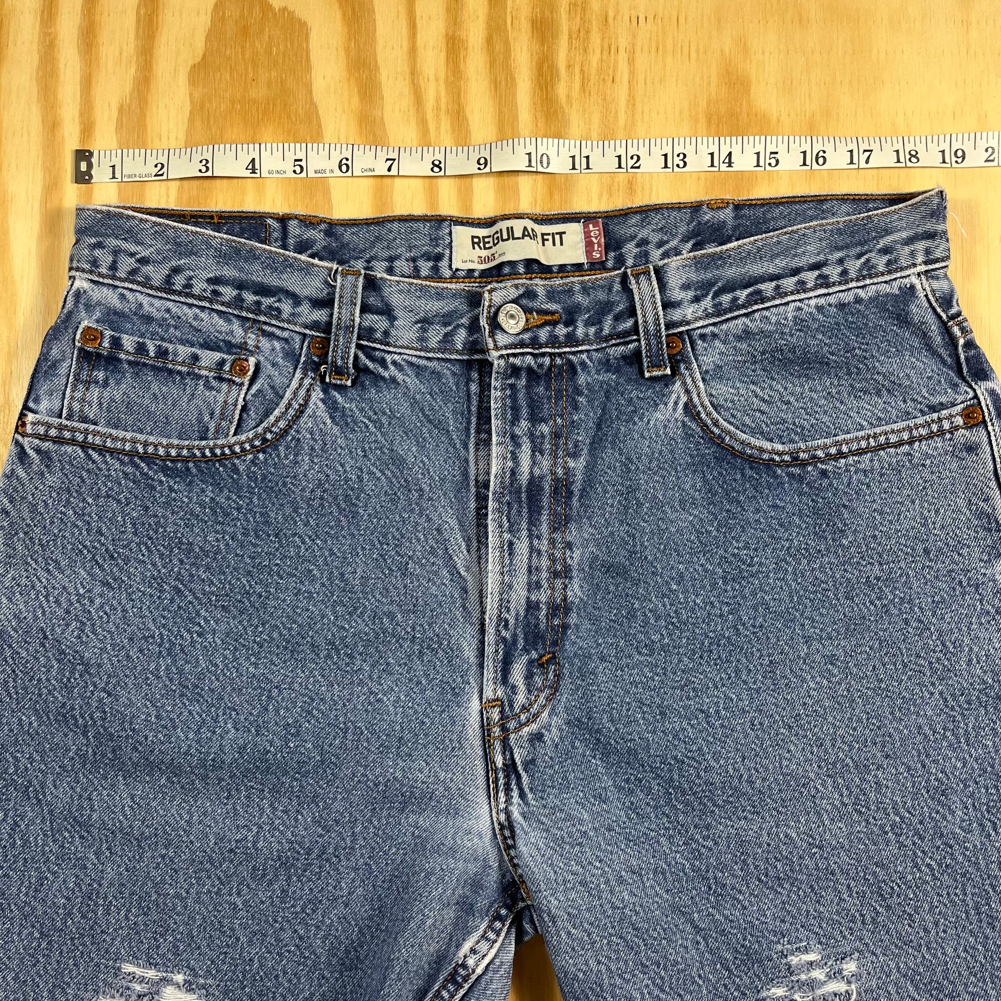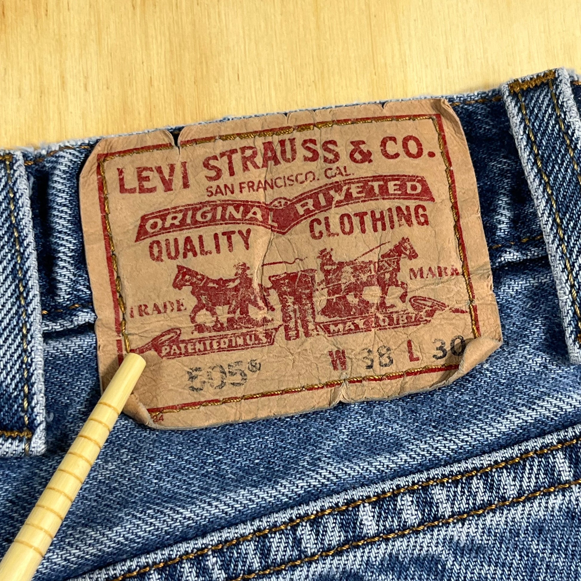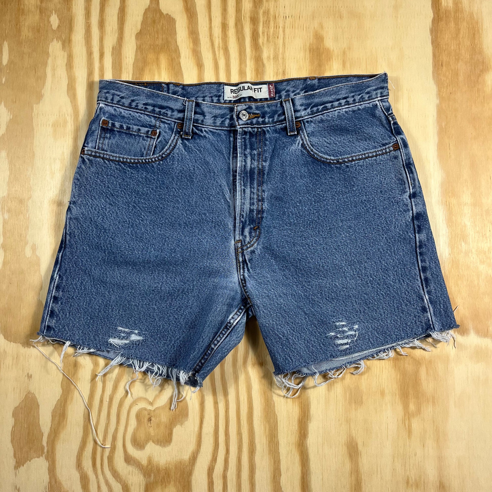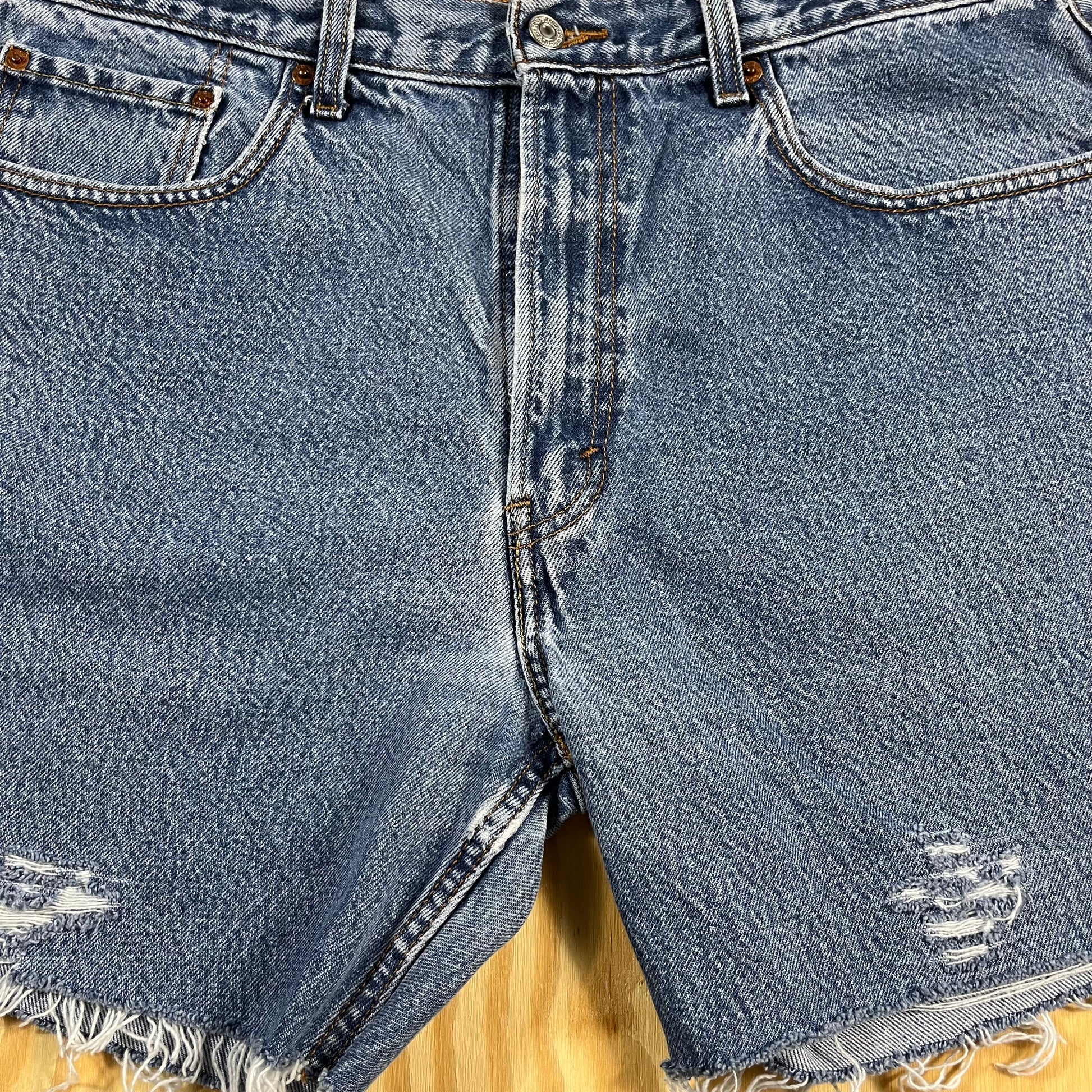 : Levi's 505, reworked jorts, custom cutoff, size 38, light distressed, 90s, streetwear, 100% cotton, raw hem, faded denim, summer