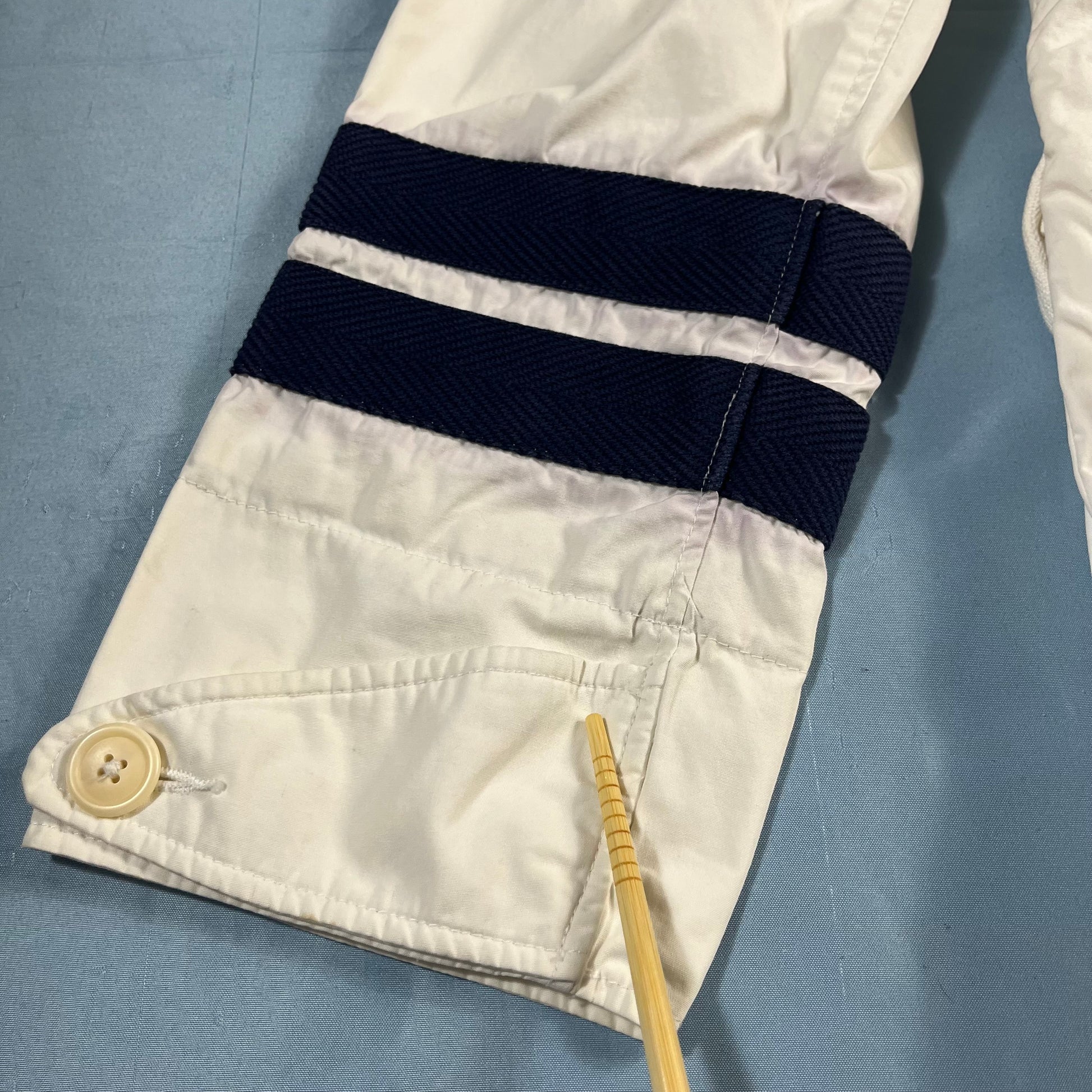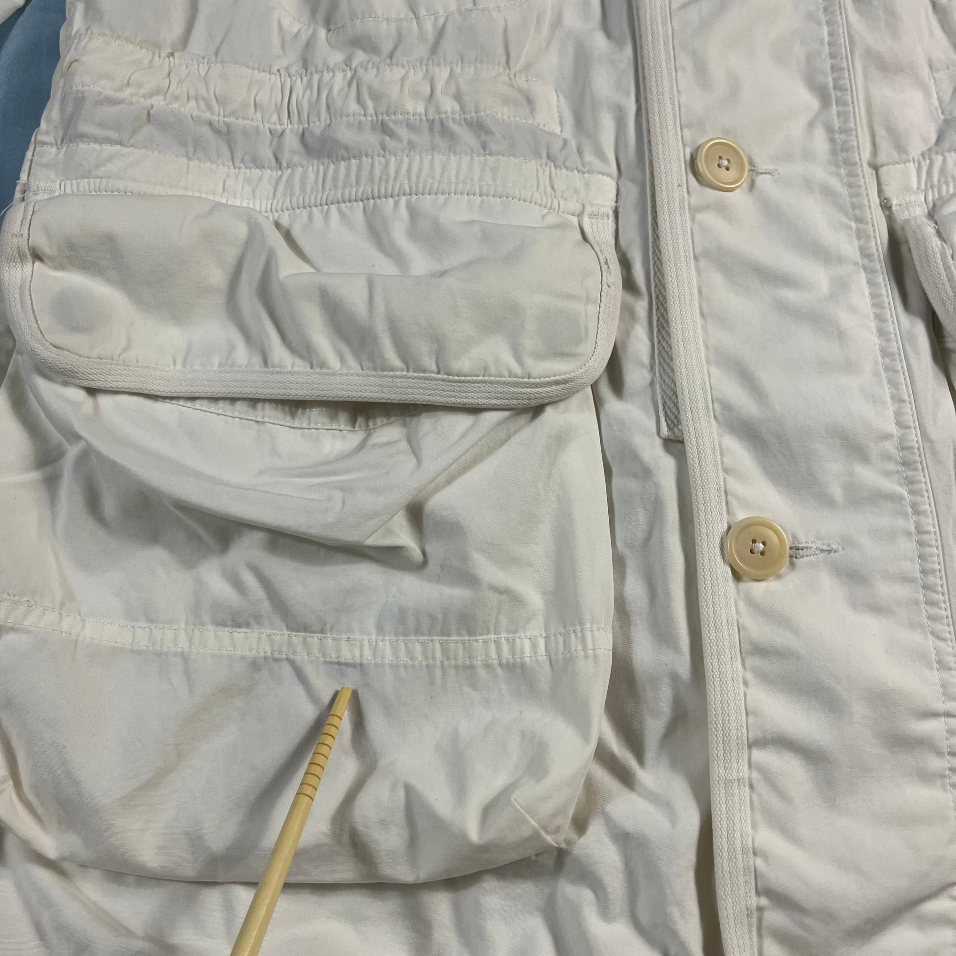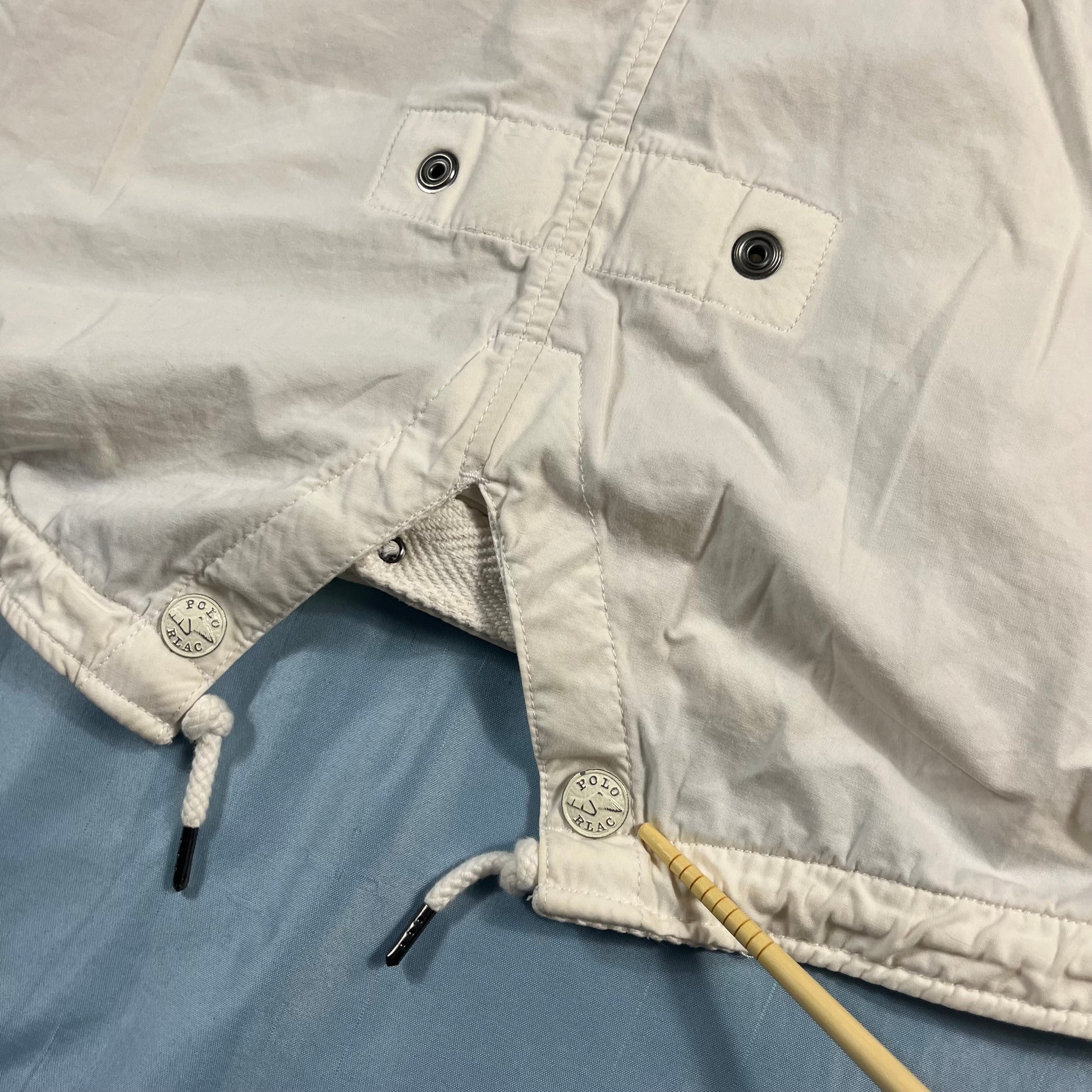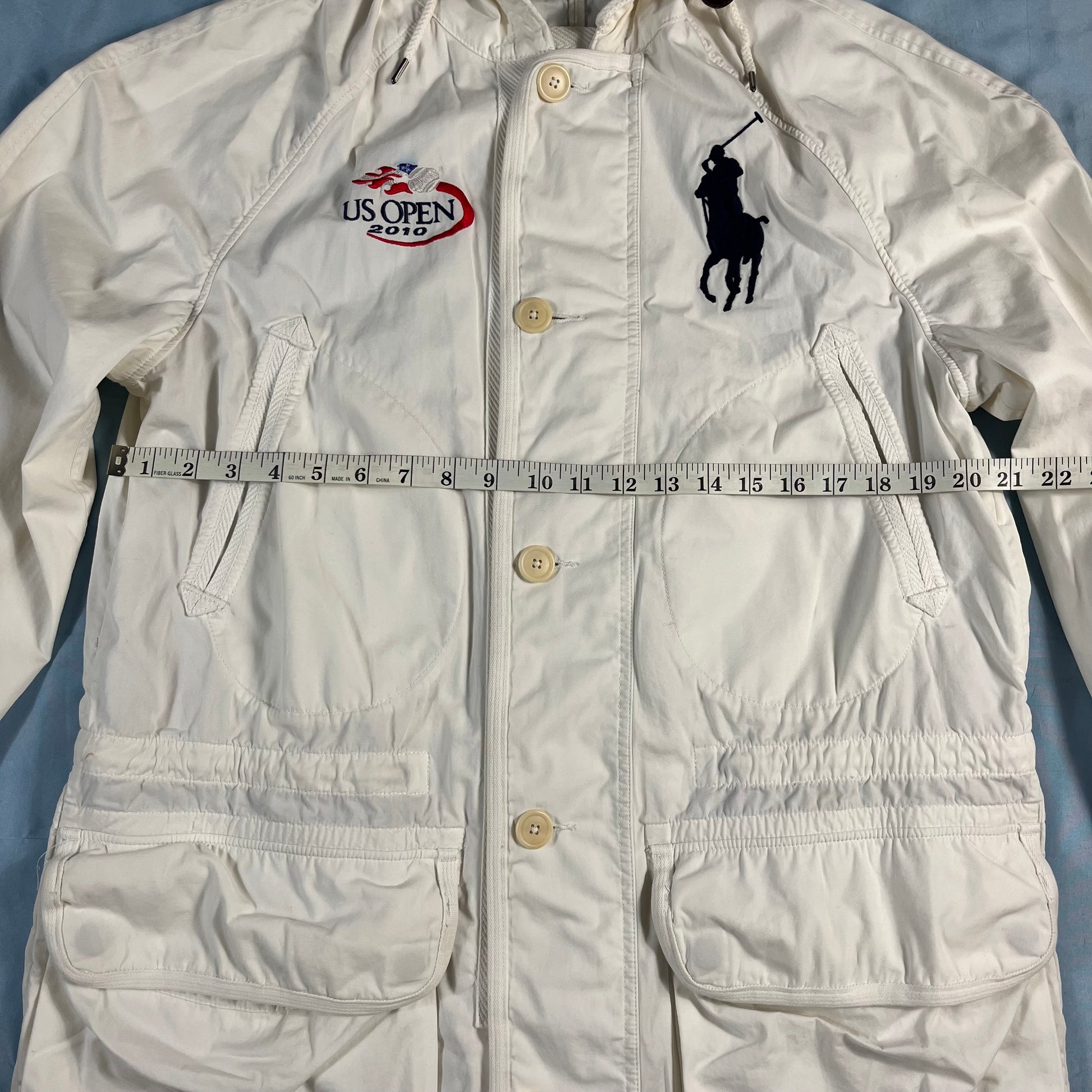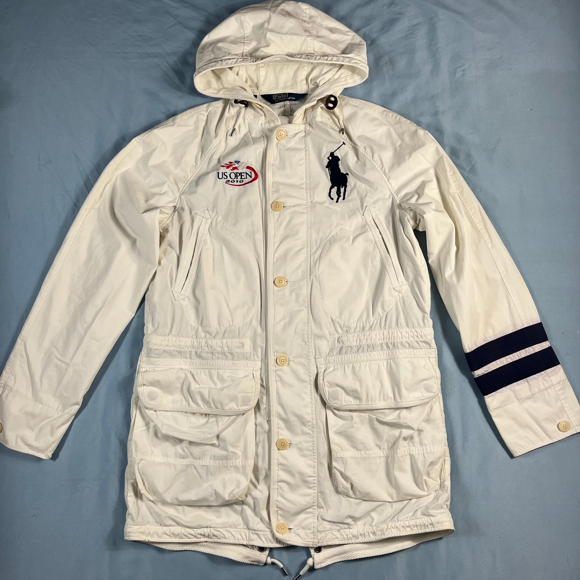 an exceptional piece of sportswear history from the Polo Ralph Lauren x Team USA collaboration for the 2010 US Open. this mid-length jacket is crafted from a crisp, lightweight 100% cotton, offering a clean and breathable layer. featuring a sophisticated multi-closure system with a full-length zipper and button-over storm flap, alongside an adjustable drawstring waist and hood for a customizable silhouette. finished in a striking white with deep blue accents, it includes oversized utility patch pockets for a functional, heritage-inspired look. a true collector's item that bridges the gap between classic americana and high-performance court style.