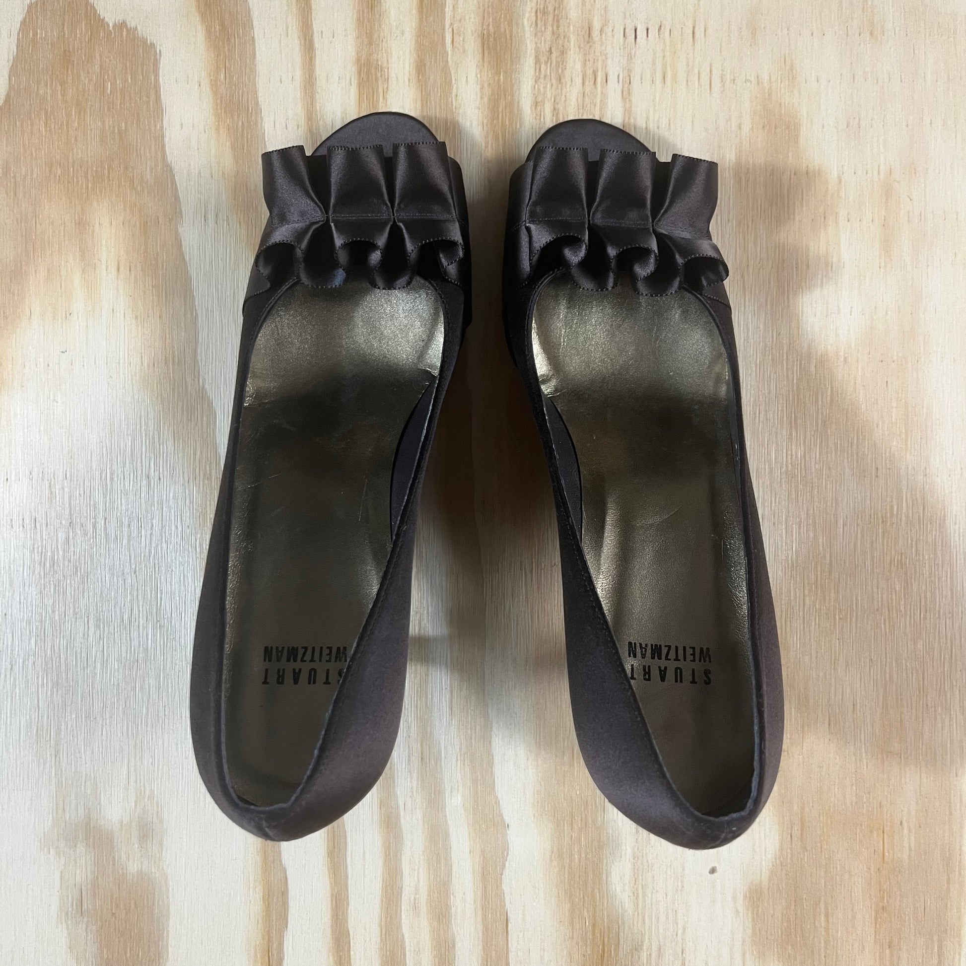 : Stuart Weitzman, designer heels, satin pumps, peep toe, ruffle heels, size 8.5, made in spain, evening shoes, formal, chocolate brown, romantic style, coquette, wedding guest, birmingham vintage
