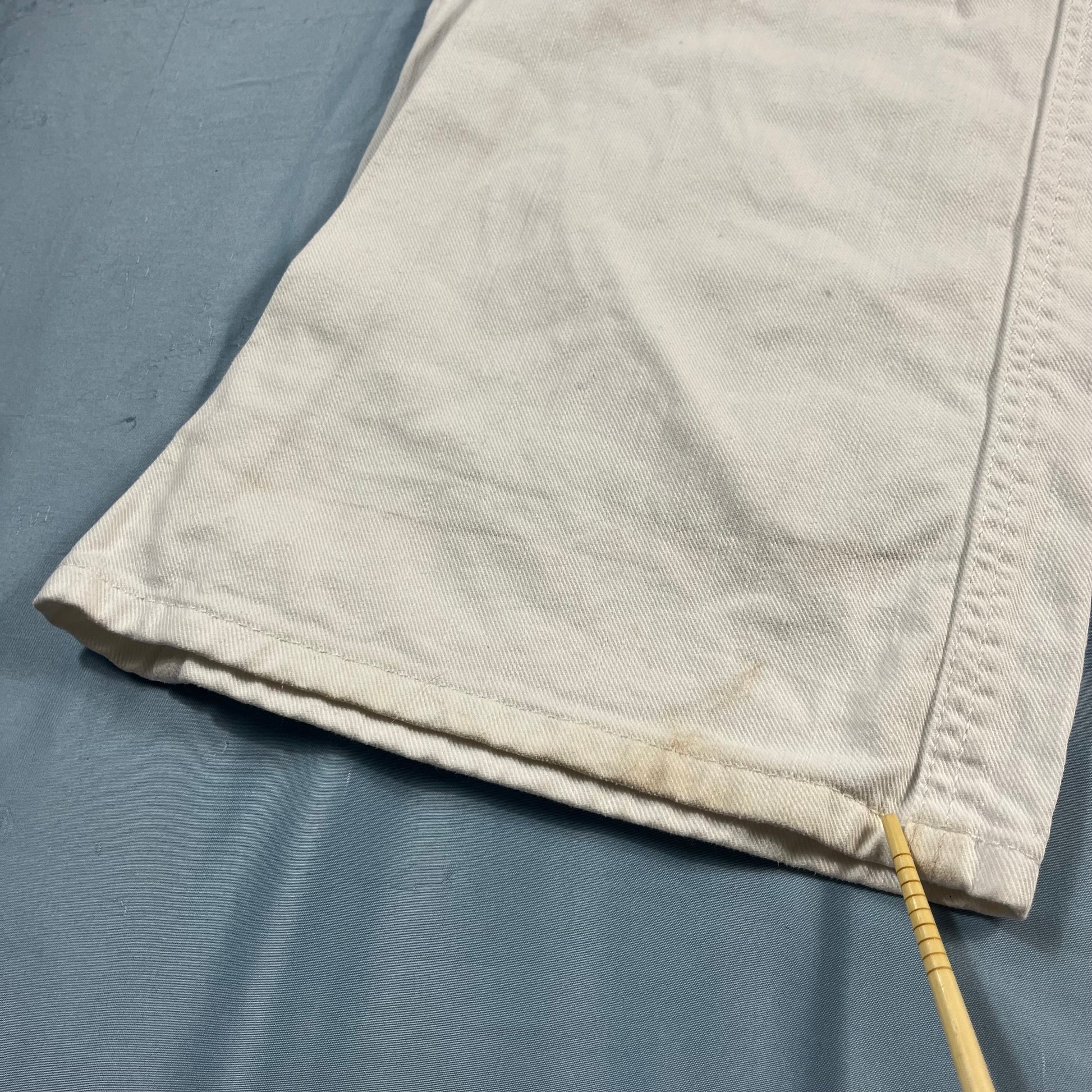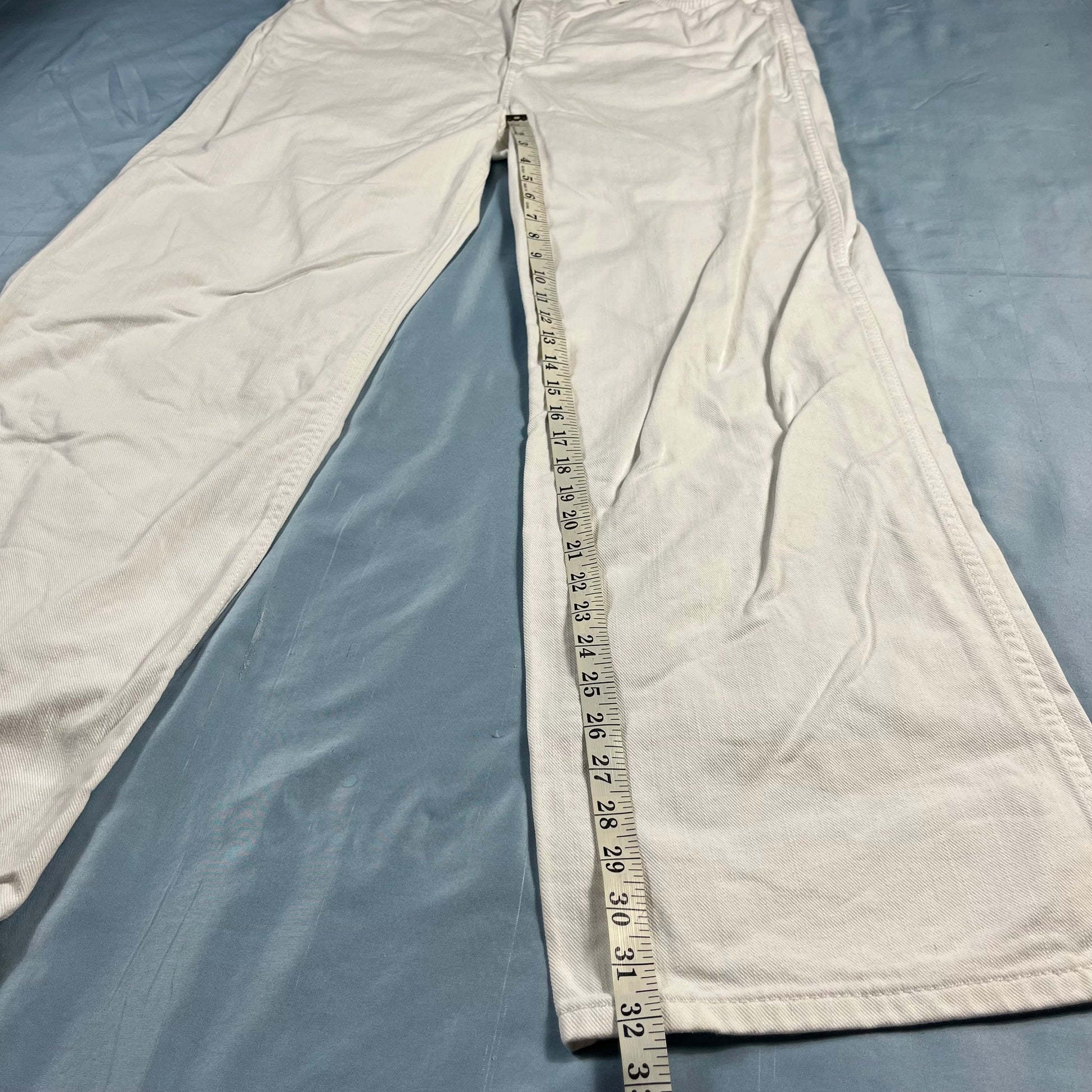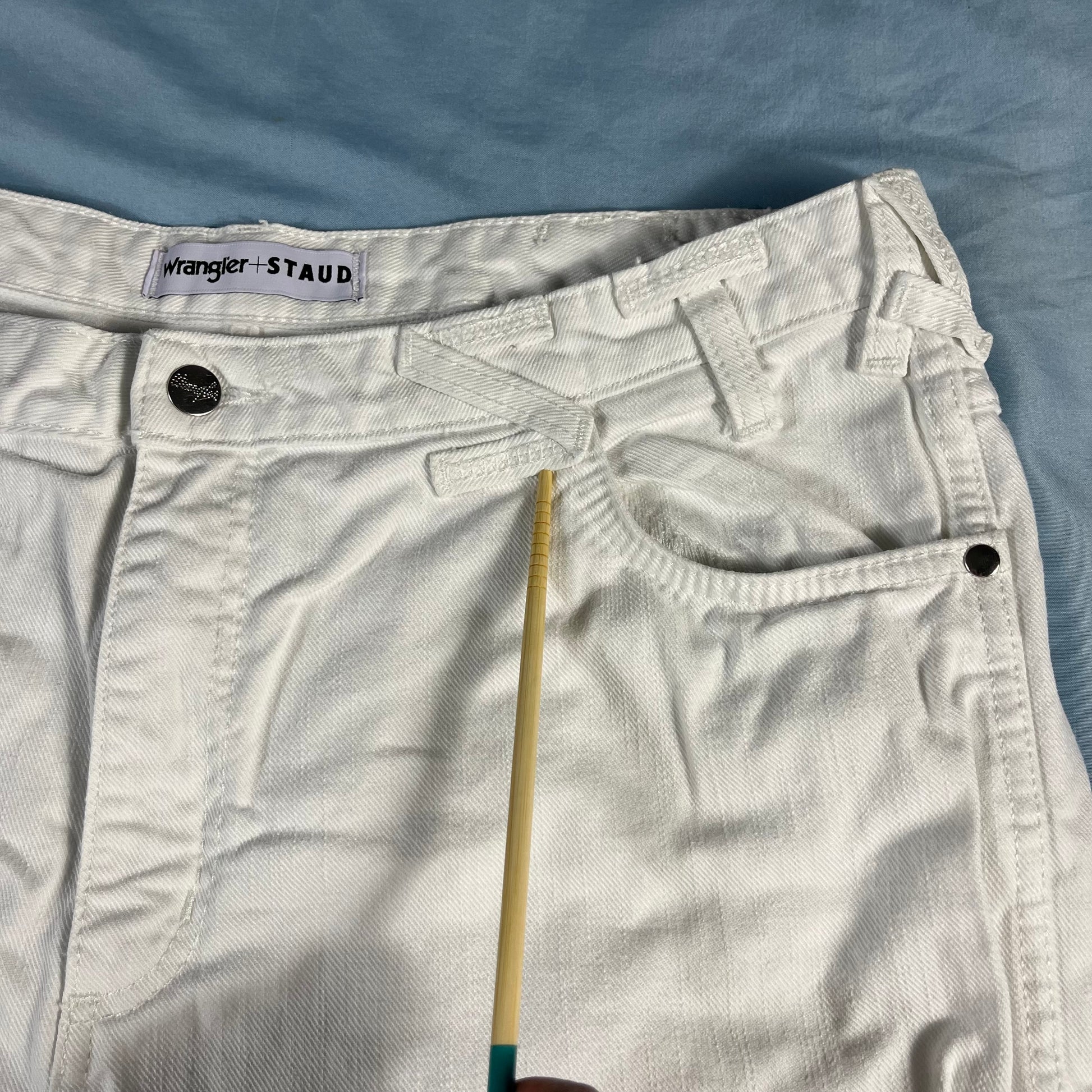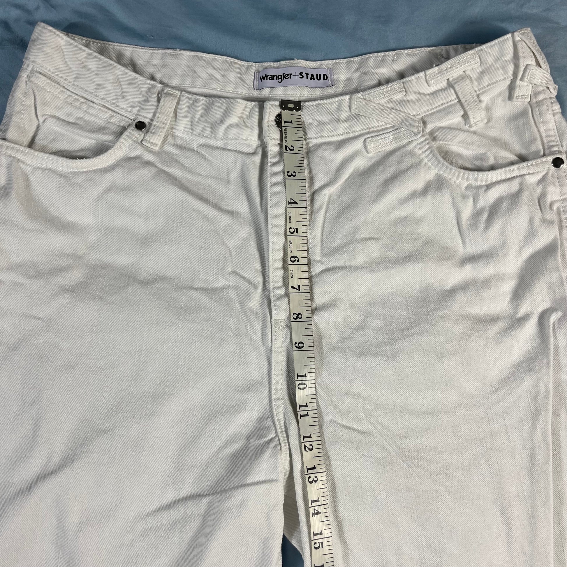 : Wrangler, STAUD, Wrangler x Staud, white jeans, straight leg, size 33, size 16, 100% cotton, designer collaboration, minimalist, utilitarian, architectural denim