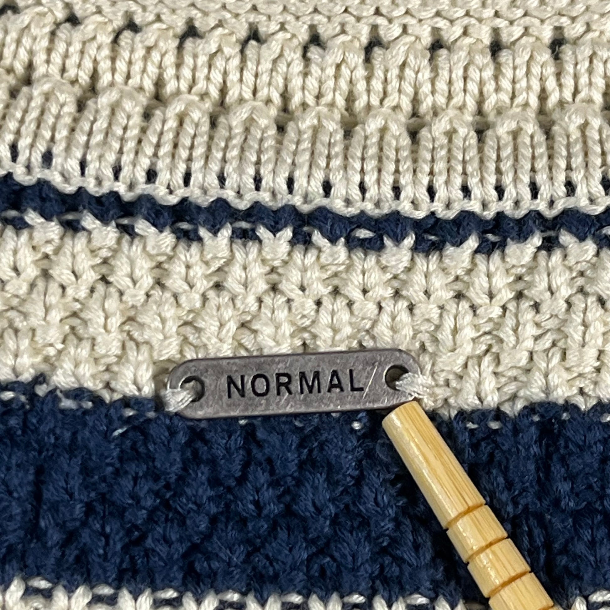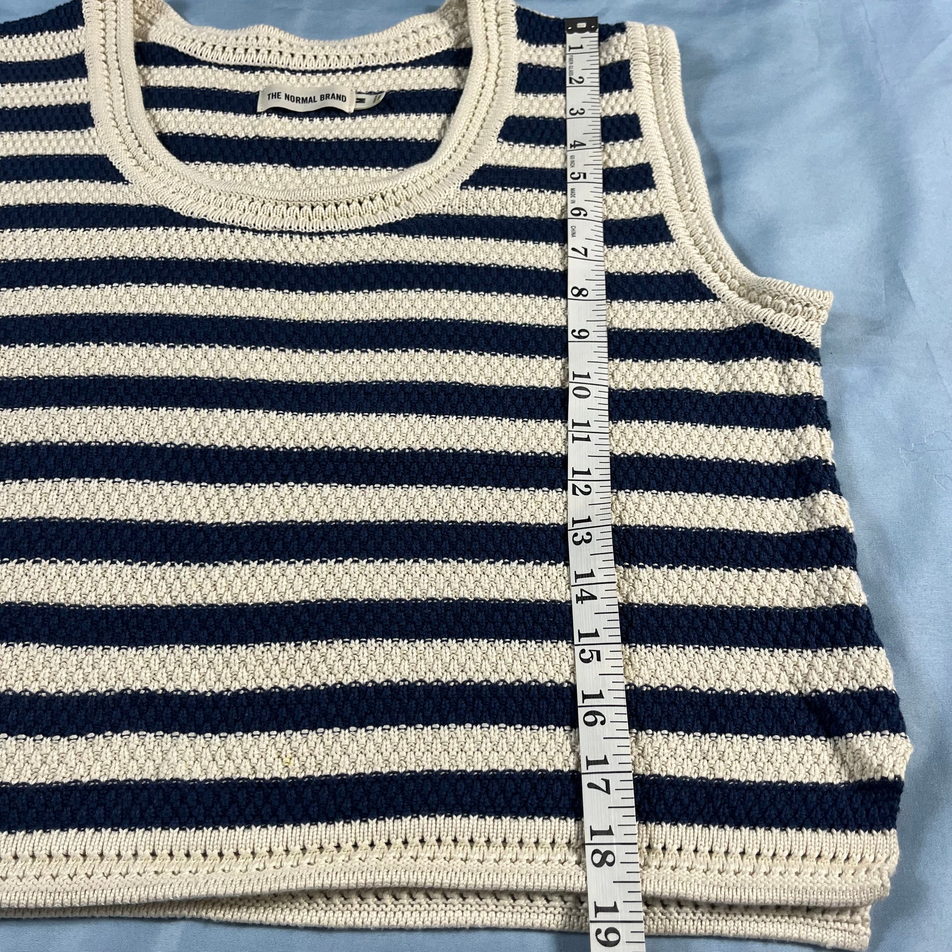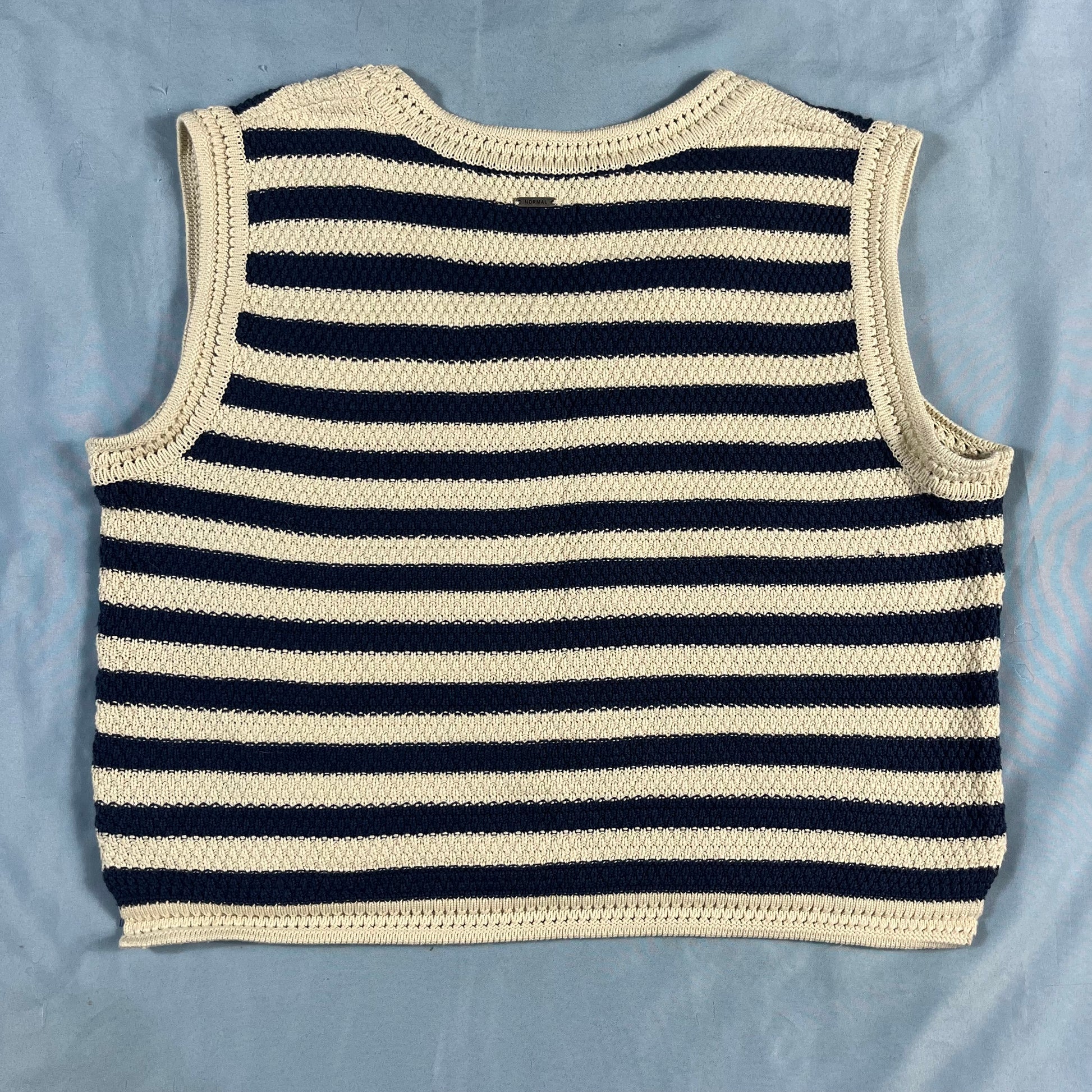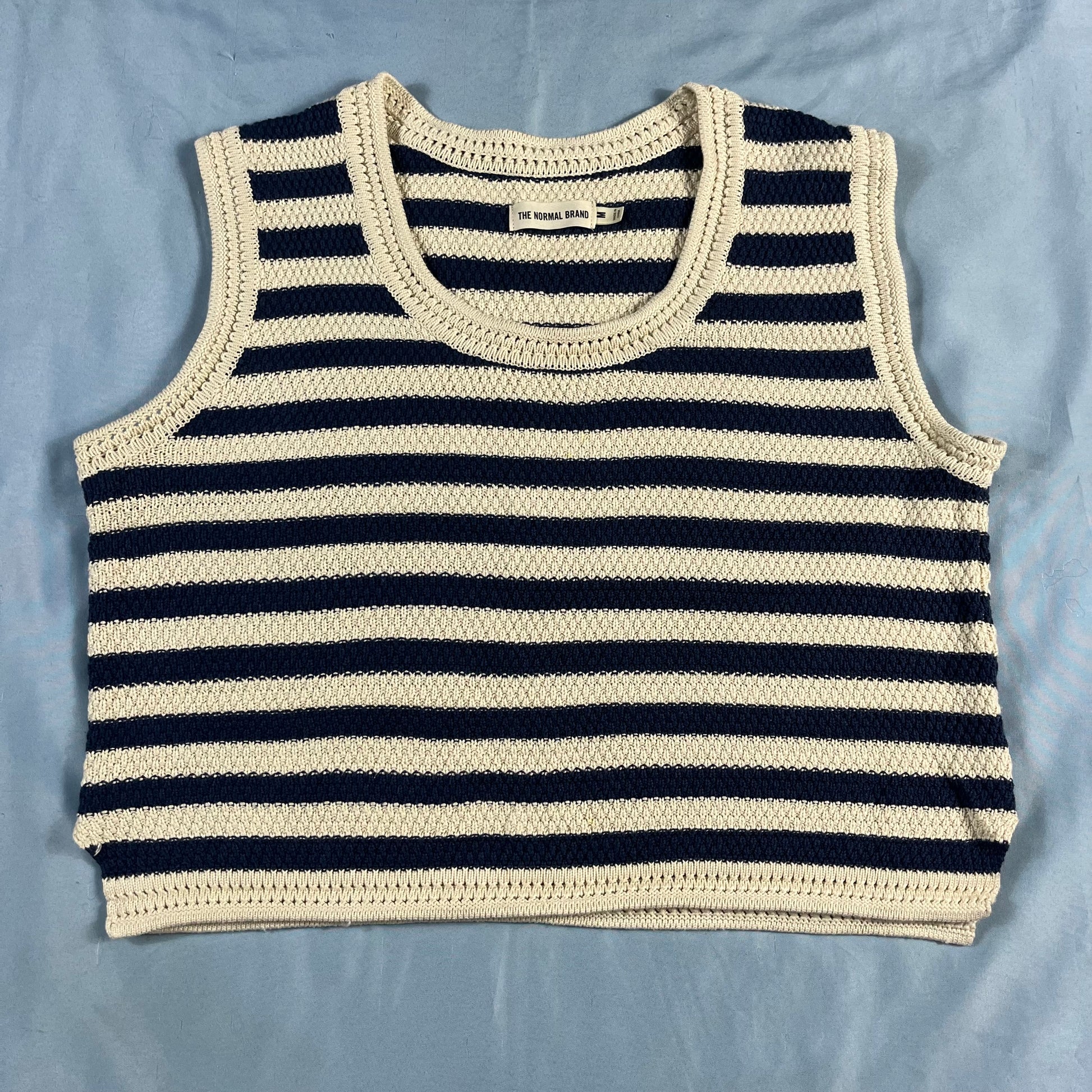 : The Normal Brand, crochet tank, striped top, sailorcore, coastal style, size Medium, blue and cream, summer knit, nautical, cropped tank, beachwear